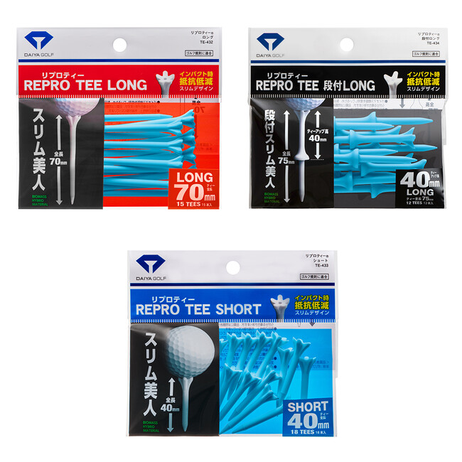 ダイヤゴルフは、国内男女トーナメント会場におけるプロサービス活動の一環として、多種多様なゴルフティーの供給サポートをたくさんのツアープロへ行っています。その活動の中で、特に女子プロゴルファーはゴルフウェアと同じような感覚で、ティーもファッションとして色で選ぶ傾向があることを当社は感じていました。女子ツアーでは非売品も含めて『リプロティー』6色のサンプルを供給していますが、鮮やかなブルー(シアン)の人気が特に高かったため、このたび『リプロティー ブルー』として商品化する運びとなりました。スリムで振り抜きが良いオーソドックスな「ロング」、常に同じ高さでティーアップしやすい「段付きロング」、アイアンやユーティリティでのティーショットで使いやすい「ショート」の3タイプから選べます。