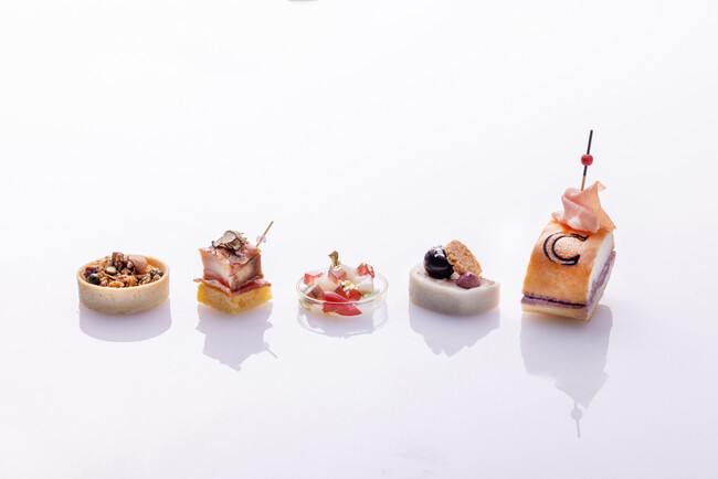 左から、「スパイスサワーチェリータルト セルヴェルドカニュと自家製グラノーラ」、「ドライチェリーチキン チェリーウッドベーコン、コーンブレッド、サマートリュフ」、「アメリカンチェリーカクテル 帆立貝柱、弓削牧場フレッシュチーズ、アスパラガス」、「アマレーナチェリーコンフィ パテドカンパーニュ、チェリーマスタード、パンデピス」、「チェリーコンポートのホットサンドイッチ ブリーチーズと生ハム」