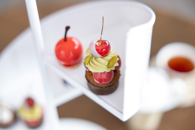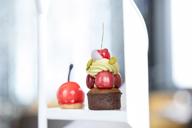 小ぶりで酸味が強いフランス産グリオットチェリーを甘さ控えめのコンポートにして使用した「チェリーチョコレートムース」は、濃厚なビターチョコレートと軽い口溶けのチョコレートムースを合わせることで、酸味をより爽やかに感じるようにバランスを調整しました。「クリスピーパリブレスト」は、酸味とほろ苦さが特徴的なイタリア産のアマレーナチェリーをベリーのなめらかなクリームと共に合わせました。中に忍ばせた玄米クリスピーが楽しい食感のアクセントになっています。大粒でハリがあり、食べごたえのある食感が魅力のアメリカンチェリーを使用した「アメリカンチェリーピスタチオタルト」は、甘味が強いのが特徴のアメリカンチェリーと、ナッツの風味とクリーミーな口当たりのピスタチオ、そして隠し味にストロベリージャムを掛け合わせました。しっかりとした果肉感となめらかなクリーム、アーモンドタルトの絶妙なバランスをご堪能ください。また、キールロワイヤルカクテルをイメージしたスイーツにほのかな山椒の風味を合わせた「山椒キールロワイヤル」や、チェリーのムースで愛らしい形を再現した「チェリーグラサージュ」も艶やかにティースタンドを彩ります。
