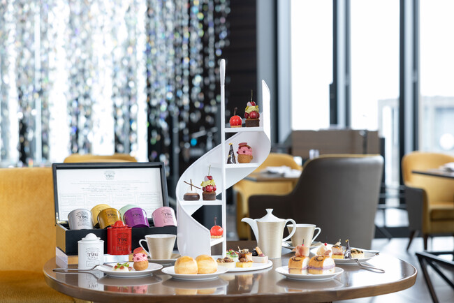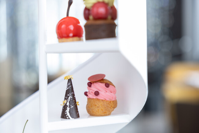 新しく初夏を彩るアフタヌーンティーは、スイーツ6種類と、セイボリーアイテム5種類、全11種類のメニューを、コンラッド大阪のアイコニックなスポット、空に浮かぶ白いリボンのような螺旋階段を模したティースタンドに並べてご提供いたします。チェリーには、フランス産のグリオットチェリーや、イタリア産のアマレーナチェリー、アメリカンチェリーを起用し、趣向を凝らして創作したスイーツとセイボリーをお召し上がりいただけます。