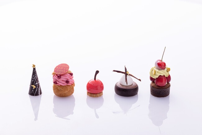 左から、「山椒キールロワイヤル チェリー、カシス、シャンパーニュ、山椒キャラメル」、「クリスピーパリブレスト アマレーナチェリー、ベリークリーム、シューパフ」、「チェリーグラサージュ チェリームース、チェリーコンフィチュール」、「チェリーチョコレートムース グリオットチェリー、ビターチョコレートムース、チョコレートスポンジ」、「アメリカンチェリーピスタチオタルト ピスタチオダマンド、アメリカンチェリー、ストロベリージャム」