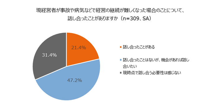 現経営者が事故や病気などで経営の継続が難しくなった場合のことについて、「話し合ったことはないが機会があれば話し合いたい」と47.2%が回答。引退予定時期は、「分からない(現状は未定)」という回答が4割(40.1%)