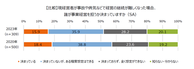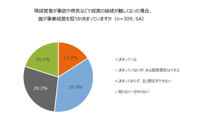 中小企業経営者の配偶者309名を対象に、現経営者が事故や病気などで経営の継続が難しくなった場合、誰が現経営者の代わりに事業経営を担うか決まっているか質問したところ、最多は、「決まっていないが、ある程度想定はできる」(35.9%)、続いて「決まっておらず、全く想定ができない」(28.2%)でした。また、「決まっている」は2割未満(15.9%)でした。