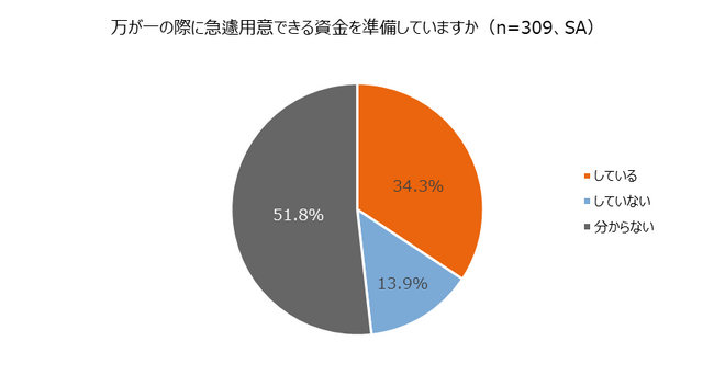 また、取引先等への支払や借入金の返済、今後の生活に対応できるよう、万が一の際に急遽用意できる資金を準備しているか聞いたところ、過半数(51.8%)が「分からない」と回答し、現経営者の会社の株式の保有状況や万が一に備えた資金など、会社の資金状況について把握できてない実態が明らかになりました。一方で、準備しているとの回答は34.3%でした。