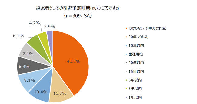 また、経営者としての引退予定時期について聞いたところ、4割以上(40.1%)が、「分からない(現状は未定)」と回答した一方で、「20年よりも先」と回答したのは11.7%でした。