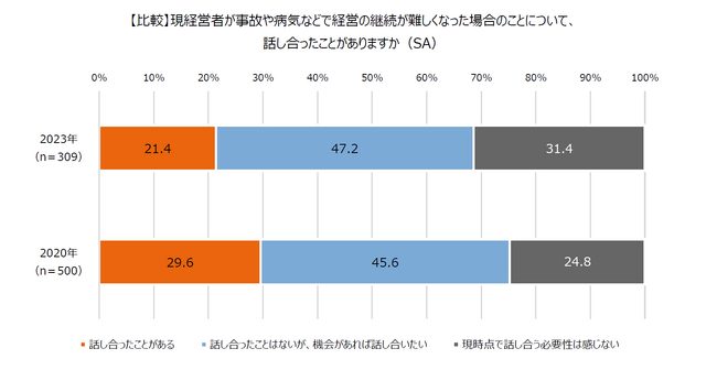 中小企業経営者の配偶者309名を対象に、現経営者が事故や病気などで経営の継続が難しくなった場合のことについて話し合ったことがあるか質問したところ、「話し合ったことがある」のは21.4%でした。一方で、「話し合ったことはないが、機会があれば話し合いたい」が47.2%と、約半数が話し合いたいと思いつつ、話し合えていないことが明らかになりました。
