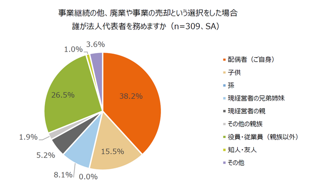 さらに、現経営者が事故や病気などで経営の継続が難しくなり事業継続の他、廃業や事業の売却という選択をした場合でも一旦は法人代表者を決める必要がありますが、その場合、誰が法人代表者を務めるか質問したところ、「配偶者(ご自身)」が38.2%と最多で、「役員・従業員(親族以外)」(26.5%)、「子供」(15.5%)と続きました。