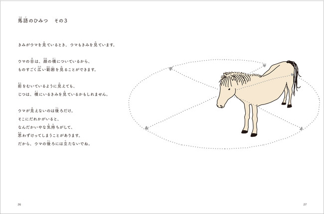 ▲ウマが見えないのは後ろだけ。そこにだれかがいると、なんだかいやな気持ちがして、思わずけってしまうことがあります。だから、ウマの後ろには立たないでね。(本文より)