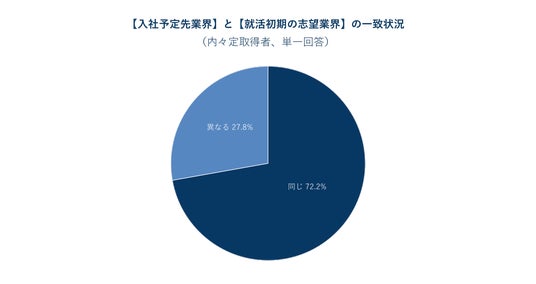 現時点で内々定を獲得している学生の「入社予定先」と「就活初期の志望業界」については、7割以上が「同じ」と回答しており、大半の学生は就活初期に志望した業界群の中から企業選びを進めていると見られる。