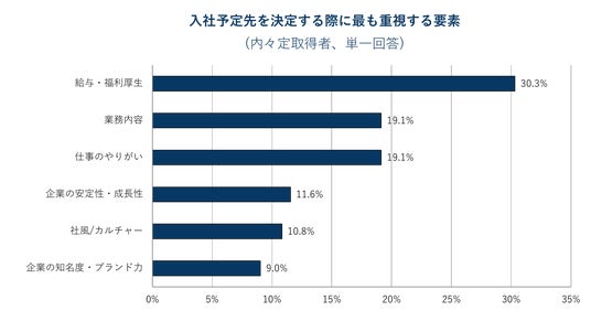 内々定を取得した学生が、入社予定先を決定する際に最も重視する要素では、「給与・福利厚生」が約3割で最も高い。また、仕事内容に関する要素(「業務内容」、「仕事のやりがい」)を合わせると4割弱と「給与・福利厚生」よりも高い。