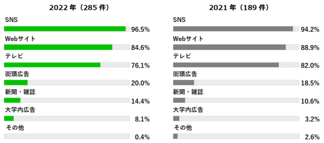 広告を見る頻度が高いと感じる媒体は、昨年に引き続きSNSがトップを維持。次いで2位、3位となったWebサイト、テレビは昨年と比較すると減少傾向にありますが、SNSは昨年よりもさらに割合が高くなる結果となりました96.5%という割合の高さからも、大学生層へのアプローチにおいてSNS広告はもはや欠かせない媒体と言えるでしょう。その他の媒体として街頭広告、新聞・雑誌、大学内広告も昨年と比較し微増傾向にあり、中でも最も増加割合が高かったのは「大学内広告」で昨年より4.9ポイント増となりました。コロナの規制緩和の影響もあり、大学生が大学に行く頻度が上がっていることが読み取れます。