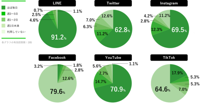 過去に実施した当社の同アンケートと比較するとTikTokの利用者が最も高い増加率となっており、2020年には19.9%、2021年には29.6%、そして今回の調査では35.5%と、一昨年から15.6ポイントの増加となりました。また前年からの変化としては、Instagramの利用率がTwitterを逆転し、1.4ポイント高くなる結果となりました。毎日利用していると回答した割合も69.5%とYouTubeに次いで約7割と高水準をキープしていることから、大学生にとって生活に欠かせないSNSとして浸透してきていることがうかがえます。