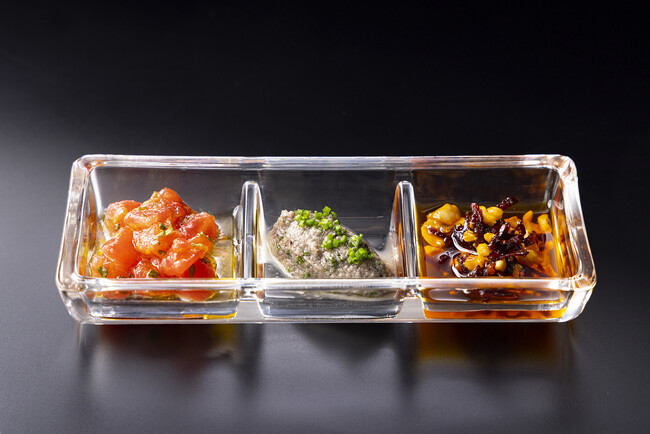 また、ラーメンに合わせるコンディメントを3種類ご用意。炒めてペースト状にしたマッシュルームにトリュフを合わせた「トリュフとマッシュルームのデュクセル」は、ラーメンの魚介スープにトリュフの香りが広がりさらに風味豊かなスープに。フレッシュトマトとバジルをレモンの皮とレモン果汁、コンラッド東京オリジナルエクストラバージンオリーブオイルで合わせた「フレッシュトマトとバジルのケッカソース」は、魚介のスープをさっぱりとしたイタリアンテイストに。チョリソーと砕いたヘーゼルナッツを炒め辛みと旨味が凝縮した食べるオイルに仕上げた「チョリソーとヘーゼルナッツの辛みオイル」は、魚介のスープを刺激的にアレンジします。コンディメントを少しずつ加えながら味の変化をお楽しみください。期間限定でご提供するコンラッド東京でしか味わうことのできない特別なラーメンをぜひこの機会にご賞味ください。