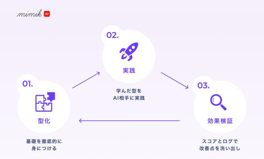 今回のmimik AIでは、これらの課題を解決し、型化 → 実践 → 評価・改善 のサイクルまで一貫して支援するトレーニング基盤へと進化しました。