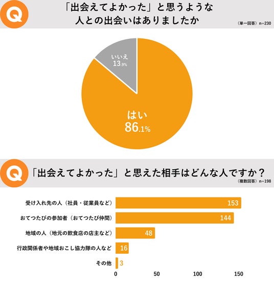 - 新しい人生を始めようとしている同世代、異世代のおてつびとさんと出会えて、刺激を受けたから。また、地域を盛り上げようと頑張っている、受け入れ先さんに出会えたから。(50代 女性)