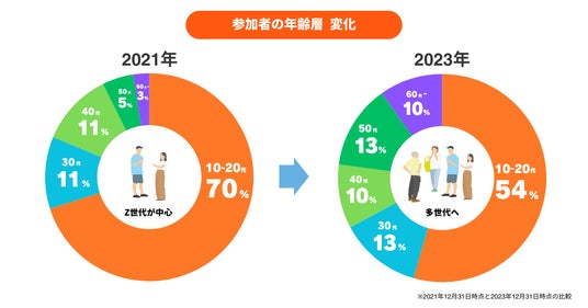 2021年12月31日時点と2023年12月31日時点での累計参加者の年齢層比較を行ったところ、50歳以上の参加者が増加していることが明らかになりました。2021年には全体の8%だった50歳以上の参加者が、2023年には23%に増加しており、シニア層の関心の高まりを反映しています。