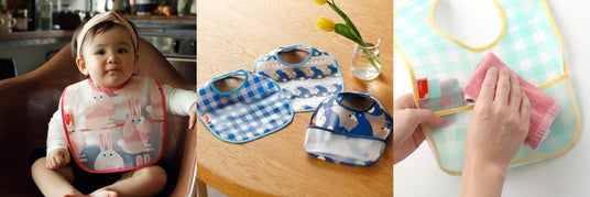 防水素材でお手入れ簡単なお食事エプロン。下部の生地を折り返せば、食べこぼしをしっかりキャッチするポケットの完成。面ファスナーで着脱楽々、バッグに入れてもかさばらないやわらかな素材で、通園・通学はもちろん、日々のお出かけでも活躍します。洗い替えに助かる3枚セットです。