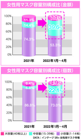 日常的にマスクを着用するようになり、マスクのラインナップも充実してきています。今回、当社が女性用マスクの販売データを調べたところ、従来は小容量(1-14枚入)が主流でしたが、2022年に入り、中容量(15-39枚入)や大容量(40枚入以上)の構成比が高くなっていることが分かりました(下図参照)。