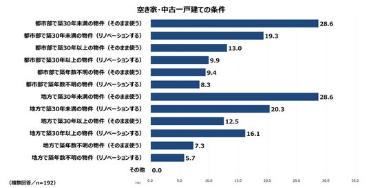 空き家・中古物件について 「どのような条件の物件を購入・検討しているか」 を尋ねたところ、最も多かったのは 「都市部で築30年未満の物件(そのまま使う)」 と 「地方で築30年未満の物件(そのまま使う)」 で、いずれも28.6%でした。築年数が比較的浅く、大きな改修を必要としない物件が、都市・地方を問わず選ばれやすい傾向がうかがえます。