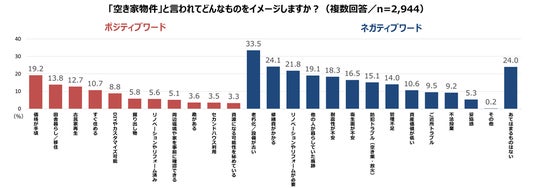 本調査実施前のスクリーニング調査(n=2,944)の段階で、空き家物件に対する回答者のイメージは、ポジティブよりもネガティブが大きく上回る結果となりました。最も多かったのは 「老朽化/設備が古い」(33.5%)で、次いで 「修繕費がかかる」(24.1%)、「リノベーションやリフォームが必要」(21.8%)といった“維持・修繕の負担”に関する懸念が多く挙げられています。また、「他の人が暮らしていた生活痕跡」(19.1%)、「耐震性が不安」(18.3%)、「衛生面が不安」(16.5%)、「防犯トラブル(空き巣・放火)」(15.1%) といった生活安全面にかかわる不安も一定数見られました。
