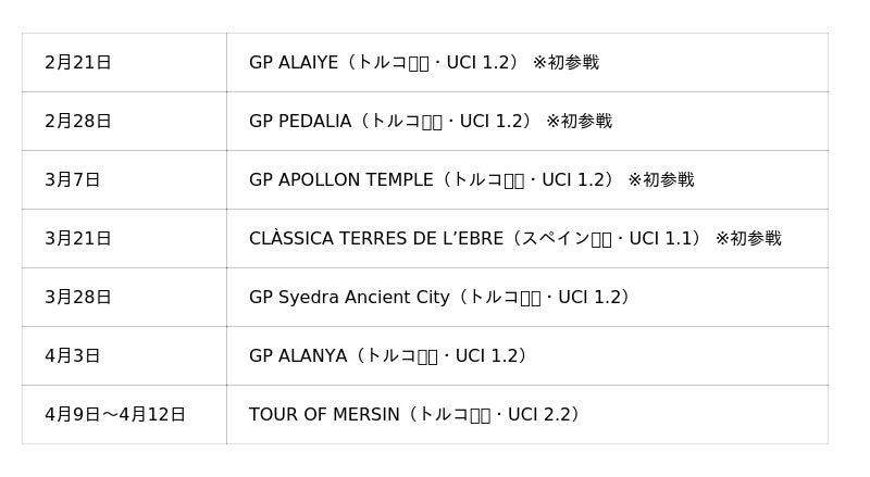 2月から4月にかけ、トルコとスペインを舞台とした過酷なUCIレースに参戦します。