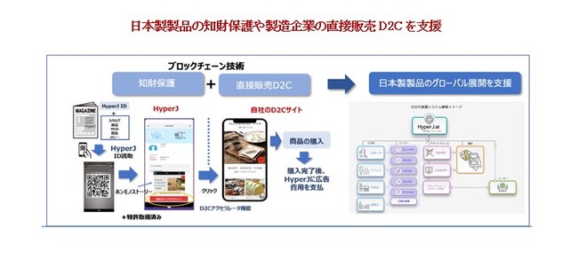 HyperJ.ai は、最先端のブロックチェーン技術と独自のアルゴリズムにより、模倣品をなくし「日本製」かつ「本物」であることを証明することができる真贋判定システムであり、日本製品を偽造品や模倣品から守る目的で開発されました。スマホでQRコードやNFCを読み取ることで、製品の真正性や品質が確認でき、消費者は安心して日本製品を購入することができます。さらに、真贋判定と同じ画面上で、生産者の思いを動画で配信できる「ホンモノストーリー」動画を通じて、製品やサービスをアピールできるだけでなく、D2Cアクセラレーター機能により直接商品の購入もできる仕組みとなっています。