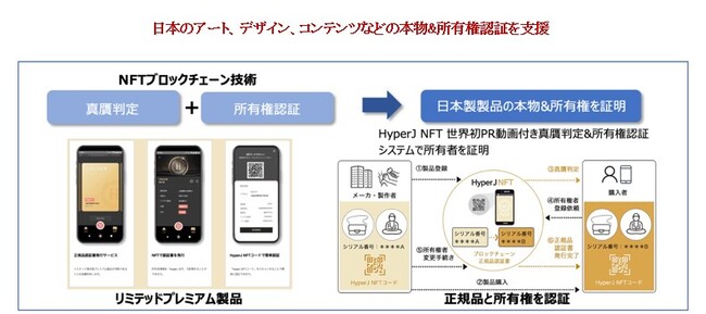 HyperJ NFTは、日本初のブロックチェーン真贋判定システムが搭載されたリミテッドプレミアム正規品認証サービスです。これにより、リミテッドプレミアム製品を安心して売買することが出来るだけでなく、ブロックチェーン上の独自のデジタルトークン NFT(Non-Fungible Token)技術を活用することで、所有者の証明も行なうことができるプラットフォームとなっています。これにより、日本製品のオリジナル性や希少性が保証され、消費者の信頼を得ることができます。また、デジタルアートや音楽、動画などのコンテンツ産業においても、著作権保護や収益化の支援を行っています。