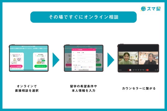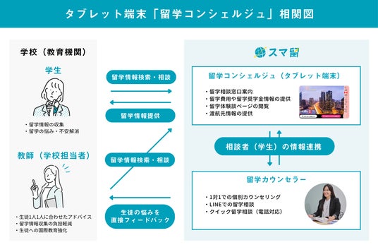 海外留学エージェント 「スマ留」 を運営する株式会社リアブロード(本社:東京都渋谷区、代表取締役社長:神田 慎)は、学生自身が主体的に海外留学について学び、相談できる オンライン留学相談窓口 を学校や学生ラウンジに設置します。またこれにアクセスできるタブレット端末機能「留学コンシェルジュ」を無料で提供します。