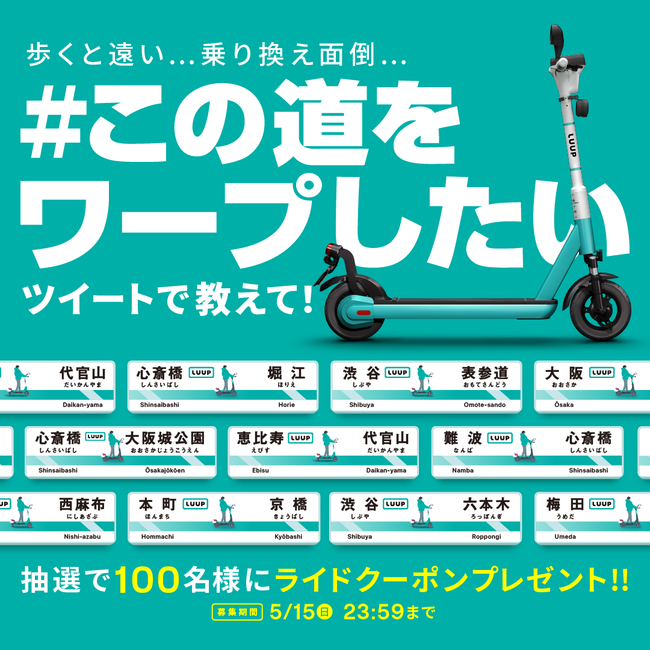 LUUP公式Twitterアカウント(@Luup_Official)をフォローした上で、「#この道をワープしたい」のハッシュタグをつけて、みなさまがLUUPで移動したいと思うルートを投稿いただくキャンペーンです。期間中に投稿いただいた方の中から抽選で、100名様に30分間ライド無料クーポンをプレゼントします。