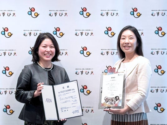【写真】2026年2月12日に実施した贈呈式の様子。右:イオン(株)責任者 GX担当 渡邉 祐子氏、左:むすびえ理事長 三島理恵