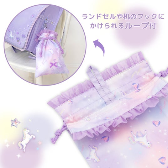 また、副教材や給食アイテムなどをまとめる巾着袋は、ランドセルや机のフックに掛けられる吊り下げループを追加し、より扱いやすい仕様に変更しました。
