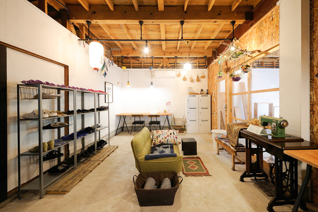 商店街にある土産物屋をリノベーションした開放的なエントランス。