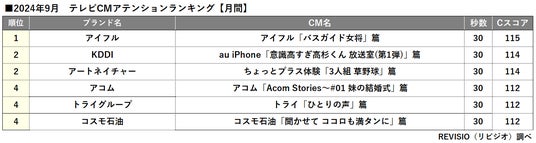 ご家庭に人体認識技術を搭載した機器を設置し、テレビスクリーンの「注視」を測るREVISIO株式会社(旧TVISION INSIGHTS株式会社、所在地 :東京都千代田区、代表取締役社長 郡谷 康士、以下REVISIO)は、 2024年9月に放送されたテレビCMを独自の「アテンション(注視)データ」で分析し、視聴者の視線をくぎづけにしたテレビCMのランキングを公開しました。