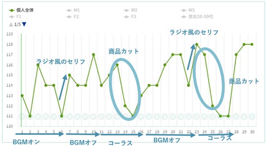 - 【23秒目】高杉くんの『一旦CMです』というセリフに対し、視聴者は違和感を覚えたか。それをきっかけに注視が回復し、その後同CM内で最も高い注視を獲得した