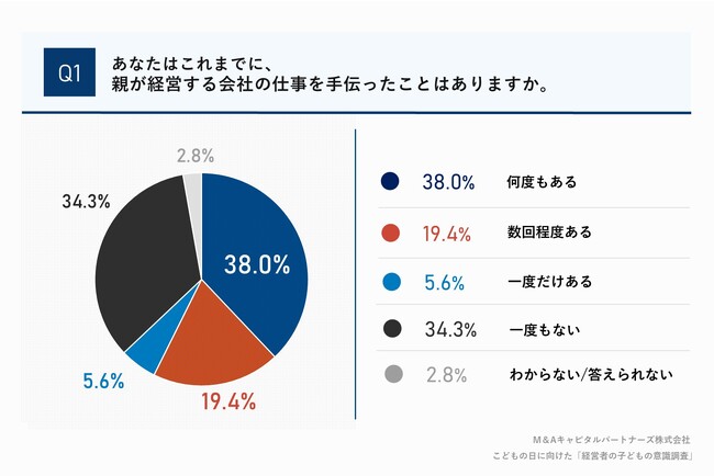 「Q1.あなたはこれまでに、親が経営する会社の仕事を手伝ったことはありますか。」(n=108)と質問したところ、「何度もある」が38.0%、「数回程度ある」が19.4%という回答となりました。