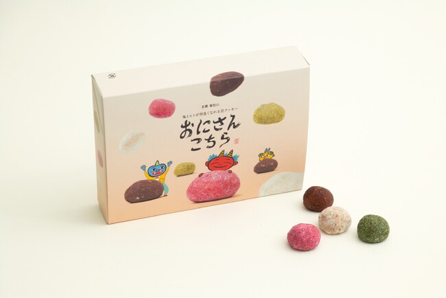 本商品のパッケージには、福知山市在住で『ONIversal city project』のキービジュアルを担当したイラストレーター、滝町昌寛(たきまちまさひろ)さん描き下ろしのイラストを活用したデザインを使用しています。滝町さんのユーモア溢れるタッチで描かれる可愛らしい鬼たちは、みんなニコニコ嬉しそうにクッキーを抱え、まさに鬼もヒトも美味しく楽しめるお菓子に仕上がりました。