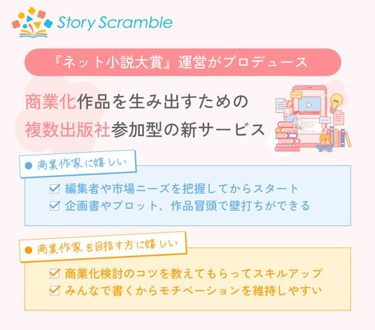 今回リリースする『Story Scramble -ストスク-』は、日本最大級の小説コンテストを運営する「ネット小説大賞」運営チームがプロデュースする、作家向けのオンラインコミュニティです。複数の出版社が参加し、「出版社のニーズ」と「作家の育成」を直結させる新たなビジネスモデルによって、作品創作の場を創出します。