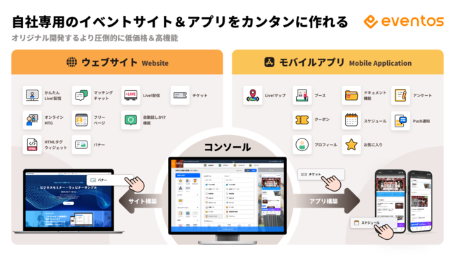 eventos(https://eventos.tokyo/)はオンラインイベント・リアルイベント双方に対応可能なイベントの公式WEB・アプリを短期間で作成、公開可能なプラットフォームです。