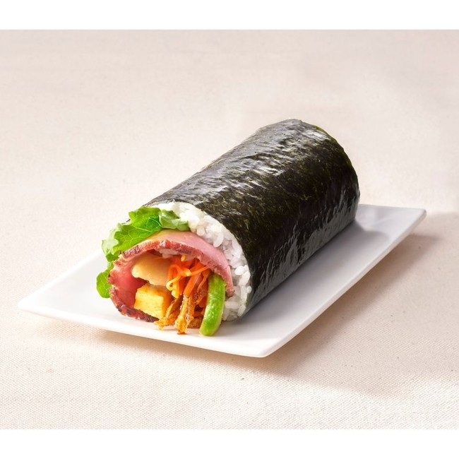 ローストビーフを、ガーリックわさびポテトやアボカドなどと巻き上げた和洋折衷の恵方巻。食べやすいハーフサイズ(9cm)。