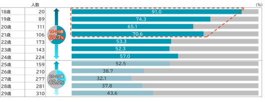 18-29歳に絞ると、25-29歳の受講経験が40.0%に対して、18-24歳は60.7%と大きな差がありました(図表2)。特に18-21歳で顕著に高い傾向にあり、18歳では約9割に上ります。これは、2022年の学習指導要領改訂により、高校での金融教育授業が拡充した影響と推察されます。この流れが続くとすれば、12年後の18-29歳の受講経験率が約9割まで引き上がることが予想されます。