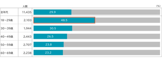 金融教育の受講経験率は全年代でおよそ3割でした。特に、若年層ほど高い傾向となり、18-29歳では48.5%と顕著に高い結果となりました(図表1)。