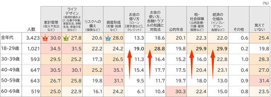 20代も「家計管理」「ライフデザイン」に関するテーマが上位となりましたが、特に「お金の借り方」「お金の使い方、金融トラブル」「税・社会保障」「経済の仕組み」に関する学習経験割合が他の年代に比して顕著に高い傾向となりました。これらの内容は、家庭科や公民科などでの学習経験が背景にあるものと推察されます。