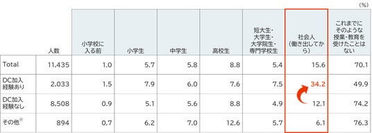 一方で、学校教育に加え、社会人向けの継続的な学習機会の整備が求められます。社会人における金融教育の機会としては、企業型確定拠出年金(DC)制度が重要な役割を果たしており、加入経験者は受講経験率が高いことが明らかになりました。