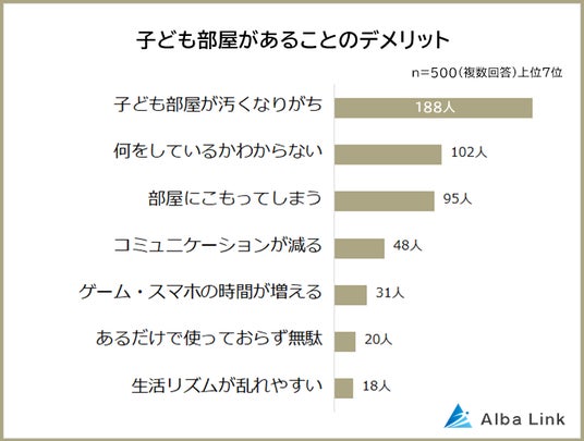 反対に、子ども部屋があることのデメリットを聞いたところ、ダントツは「子ども部屋が汚くなりがち(188人)」でした。2位「何をしているかわからない(102人)」、3位「部屋にこもってしまう(95人)」も多くの票を集めています。