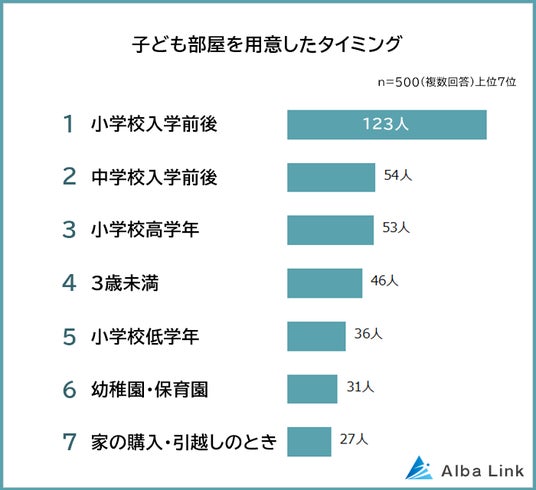株式会社AlbaLink(本社:東京都江東区、代表取締役:河田 憲二)は、小学生~高校生までのお子さんがいる500人を対象に「子ども部屋を用意したタイミングに関する意識調査」を実施し、そのデータをランキングにしました。