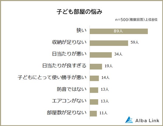 子ども部屋の環境に関する悩みの1位は「狭い(89人)」、2位は「収納が足りない(59人)」でした。