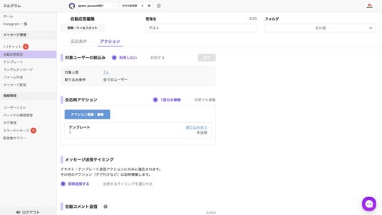 株式会社ミショナが提供するInstagram(インスタ)運用ツール「エルグラム」のDM自動送信機能に、アクションスケジュールやクイックテストなどが追加。自動配信数や配信先ユーザーの把握も可能に。