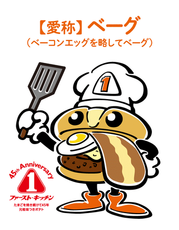 ウェンディーズ・ジャパン株式会社及び、ファーストキッチン株式会社 (所在地:東京都新宿区、代表取締役:紫関修) は、ファーストキッチンが昨年9月に創立45周年を迎えたことを記念して、お客様よりマスコットキャラクターの公募を実施しました。応募総数はなんと420点!たくさんのご応募をいただき誠にありがとうございました。当社の特徴やイメージを踏まえて選考した結果、創業当初よりお客様から愛され続けている看板商品「ベーコンエッグバーガー」をモチーフとしたキャラクター『ベーグ』が大賞作品として決定しました!大賞に選ばれた作品は今後、公式マスコットキャラクターとして、様々なプロモーションやPR活動で活躍していく予定です。今後の活動にご期待ください。