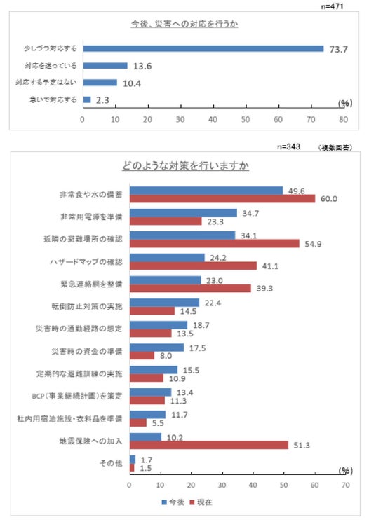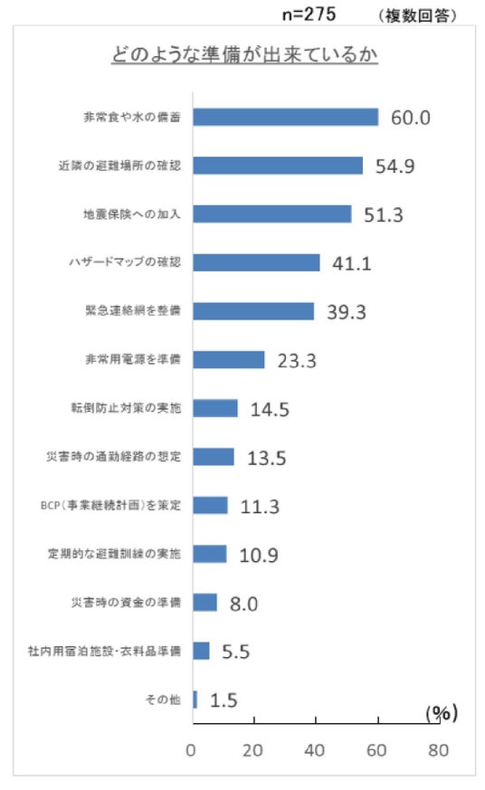 準備されているのは、「非常食や水の備蓄」や「近隣の避難場所確認」「ハザードマップの確認」が上位を占めましたが、「災害時の通勤経路の想定」や「BCPの策定」「定期的な避難訓練の実施」は下位となり、実効性のある対策は今のところ不十分です。