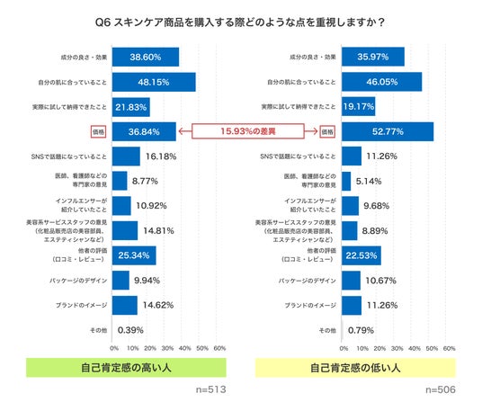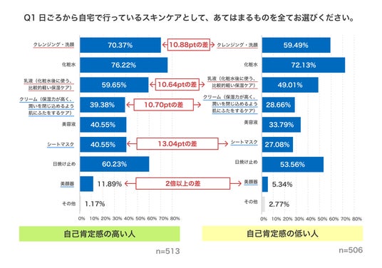 こうした背景から、自己肯定感の高低によって、スキンケアに対する関心や実践行動に違いが見られるのではないかと考えます。